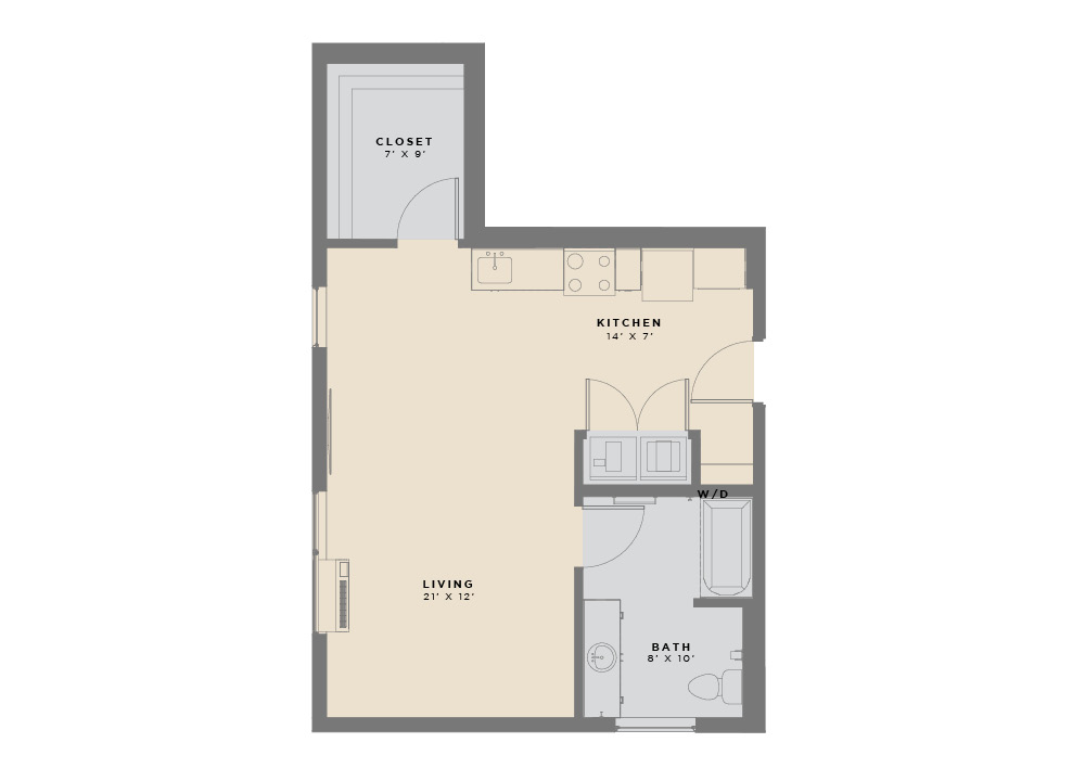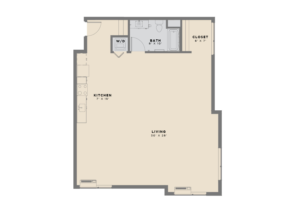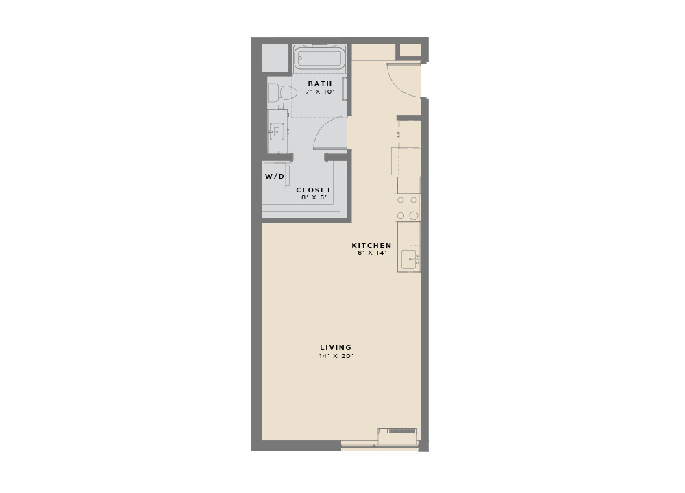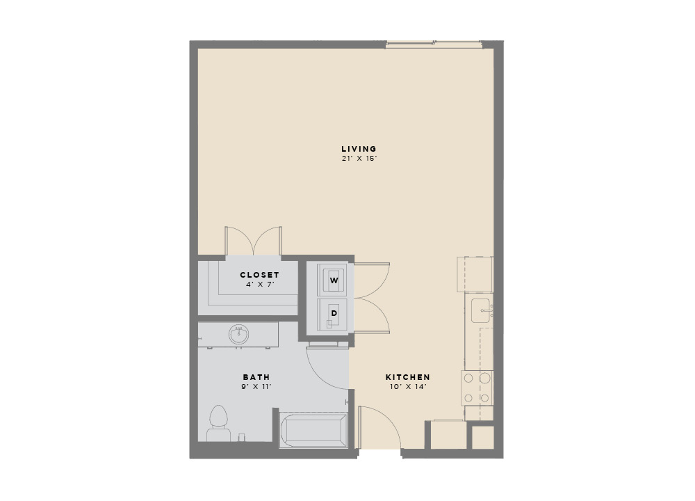The Zurich floor plan will surely be your oasis as it is, in fact, the penthouse of studio apartments! Over 1,000 square feet of living space and a large walk-in closet!